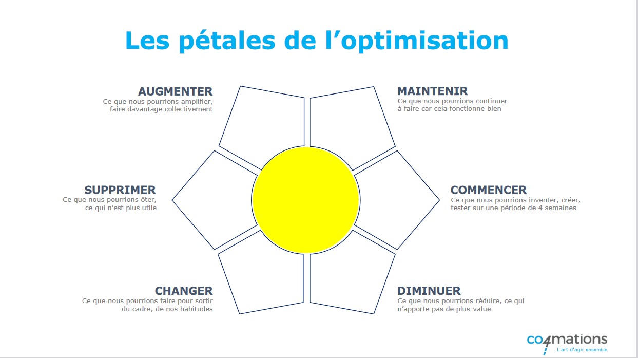 Bienvenue dans l’univers des “Pétales de l’Optimisation”, un modèle conçu pour cultiver une culture d’amélioration constante au sein de nos processus et actions. Cet outil novateur offre une approche structurée pour évaluer et optimiser nos pratiques, stimulant ainsi la réflexion sur les aspects essentiels de notre démarche.