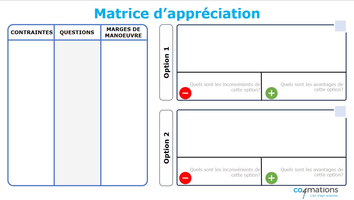 La “Matrice d’appréciation” guide de manière structurée le processus de prise de décision collective en offrant une vision claire des éléments qui influent sur la situation. En orientant les discussions vers une compréhension partagée, cet outil favorise l’émergence d’options diverses et stimule le consensus au sein du groupe.