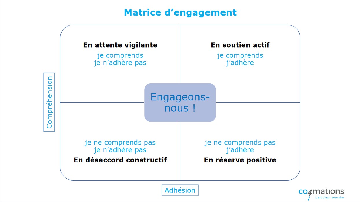 Bienvenue dans le monde de la “Matrice d’Engagement”, un outil soigneusement conçu pour approfondir la compréhension d’un thème et susciter l’adhésion au sein d’un groupe. Cette matrice novatrice exploite les axes de compréhension et d’adhésion, ainsi que quatre cadrans, pour orienter le processus de discussion de manière stratégique.